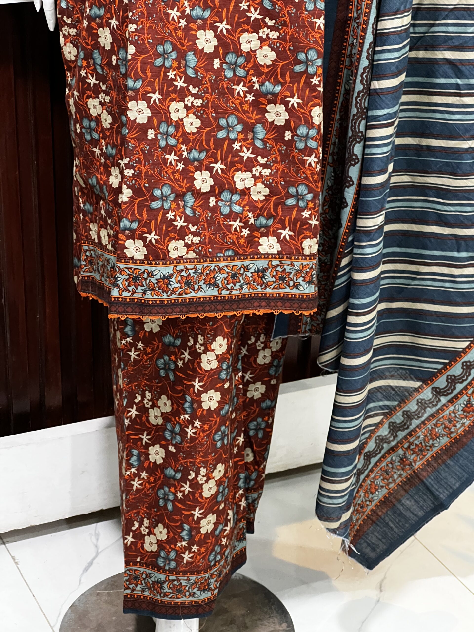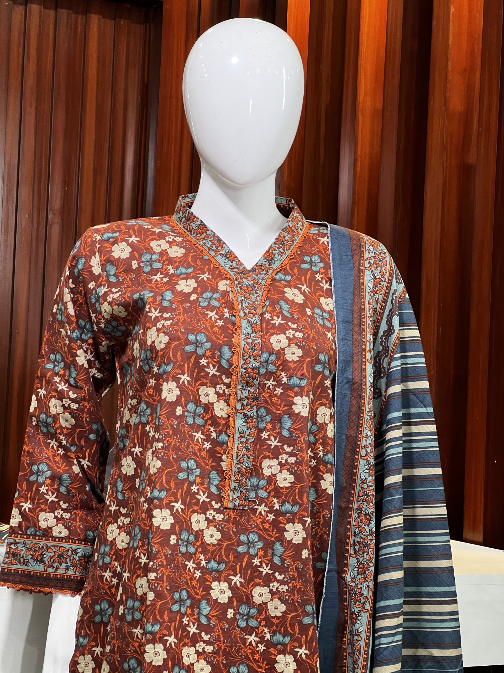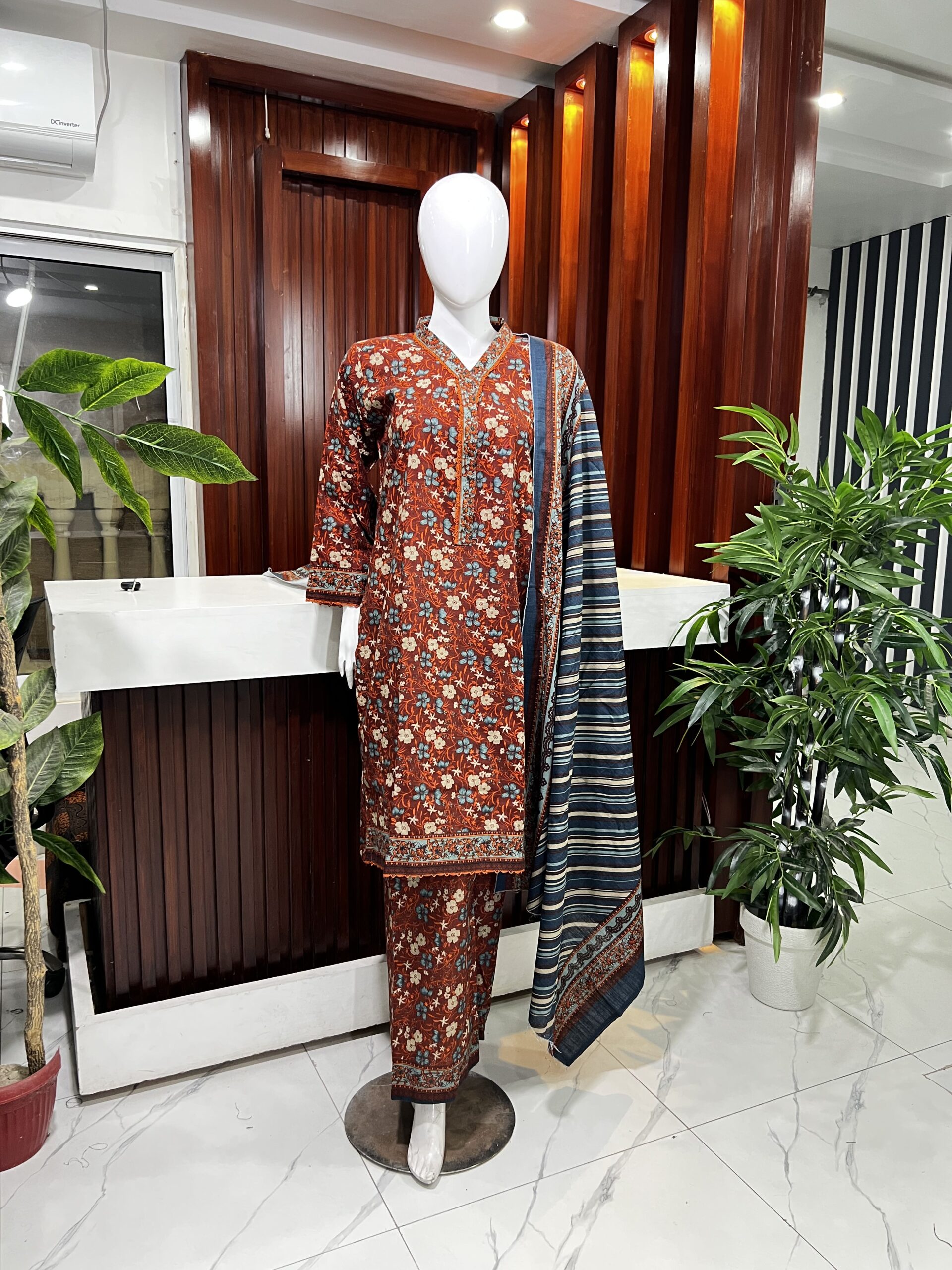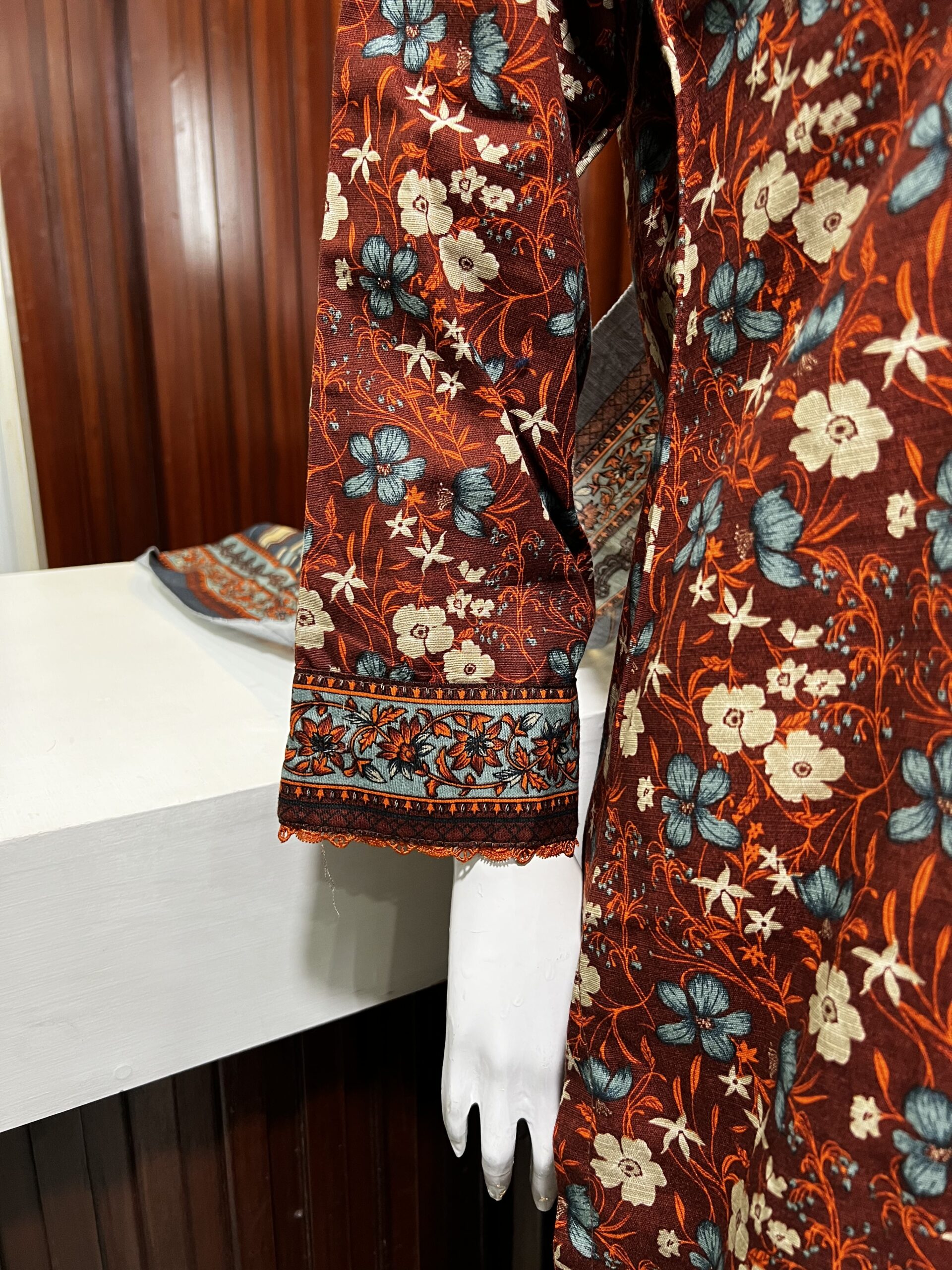 This elegant 3-piece khaddar suit features a beautifully detailed print that brings a refined, traditional charm to your winter collection. The shirt is designed with a classic straight cut, enhanced by a delicately embellished neckline and lace-trimmed borders for a graceful finish. Paired with a matching trouser and a coordinating dupatta showcasing intricate patterns, this outfit offers a complete, stylish look. Perfect for daily wear and seasonal gatherings, combining comfort, warmth, and timeless style.
