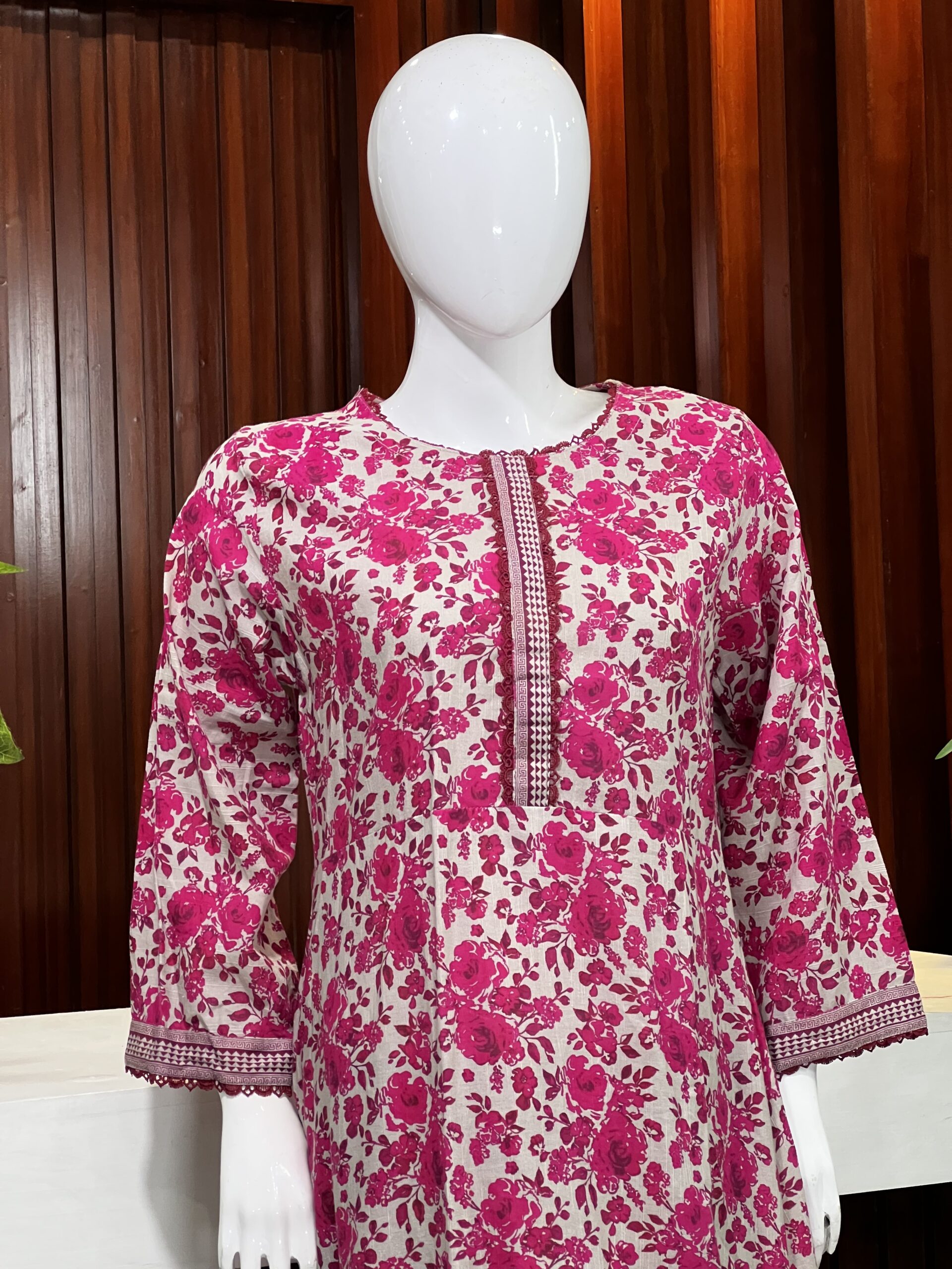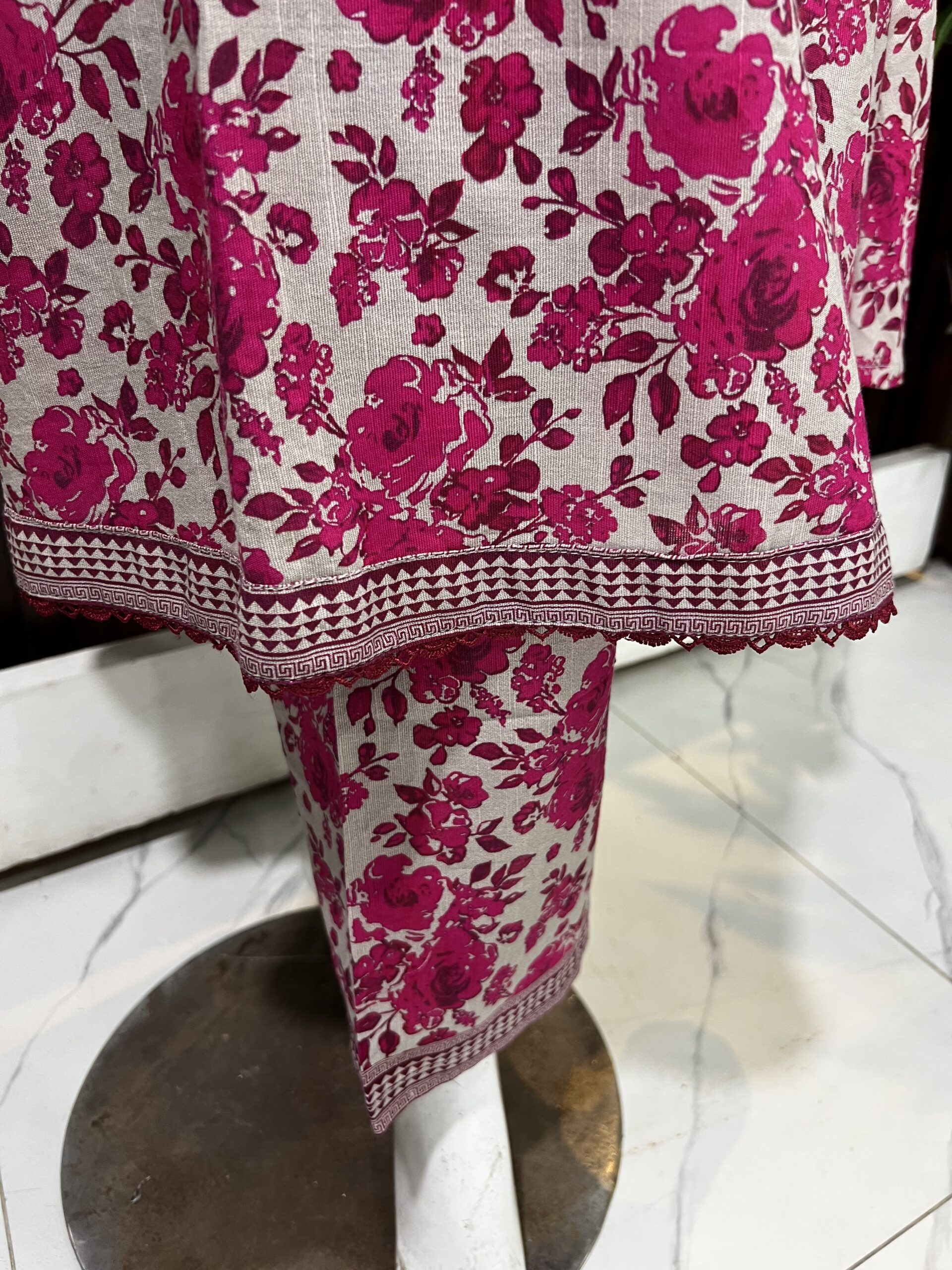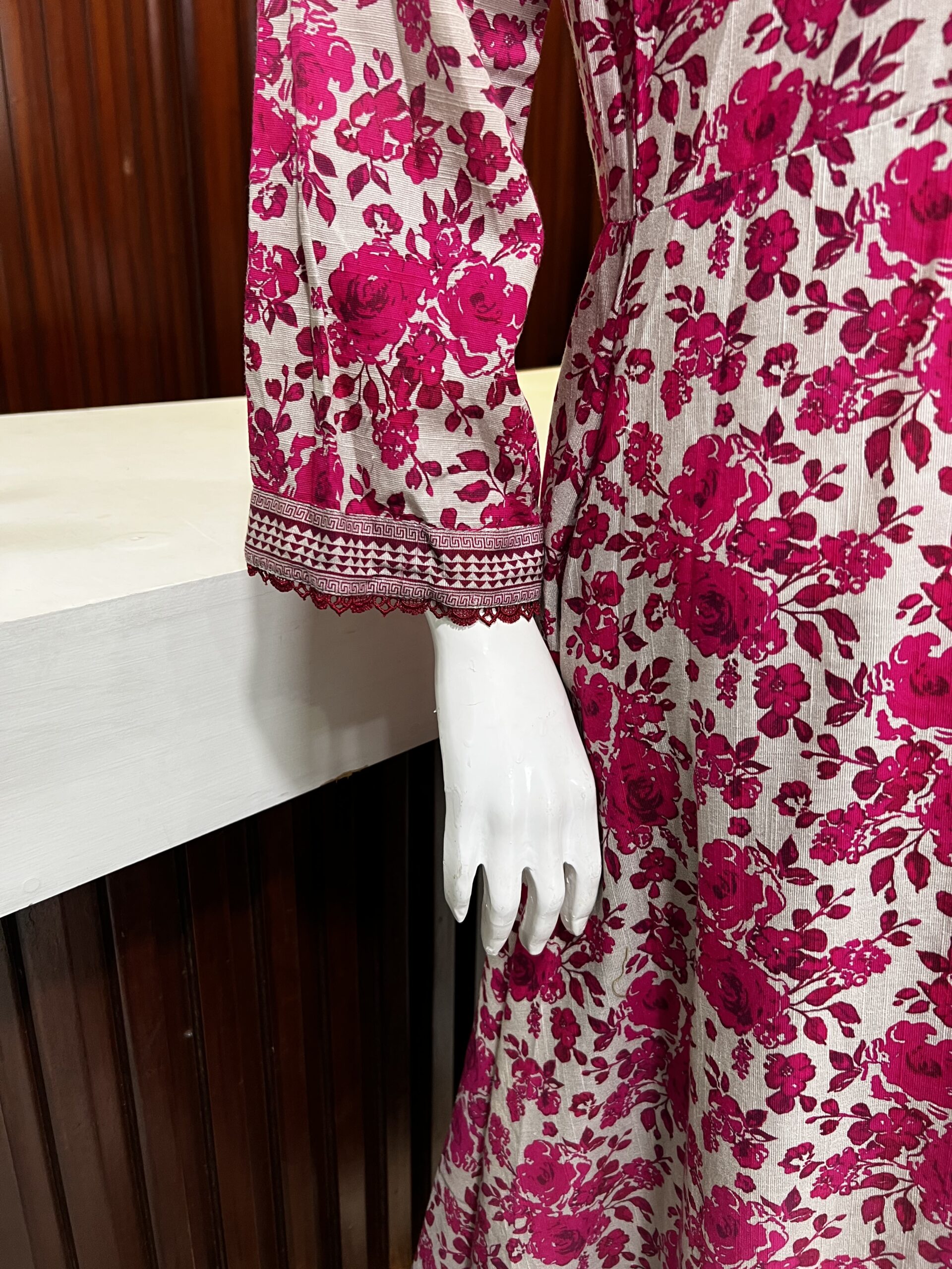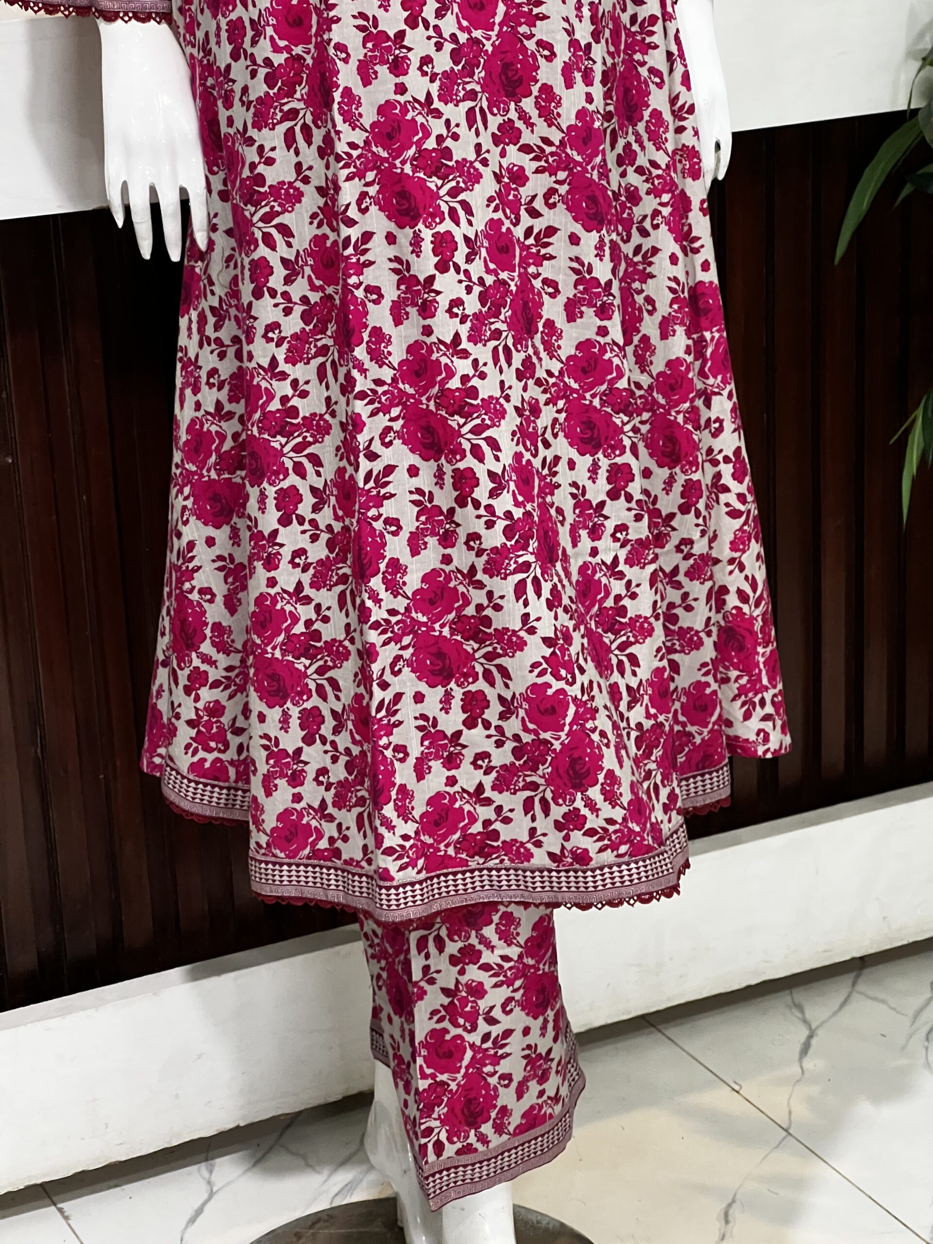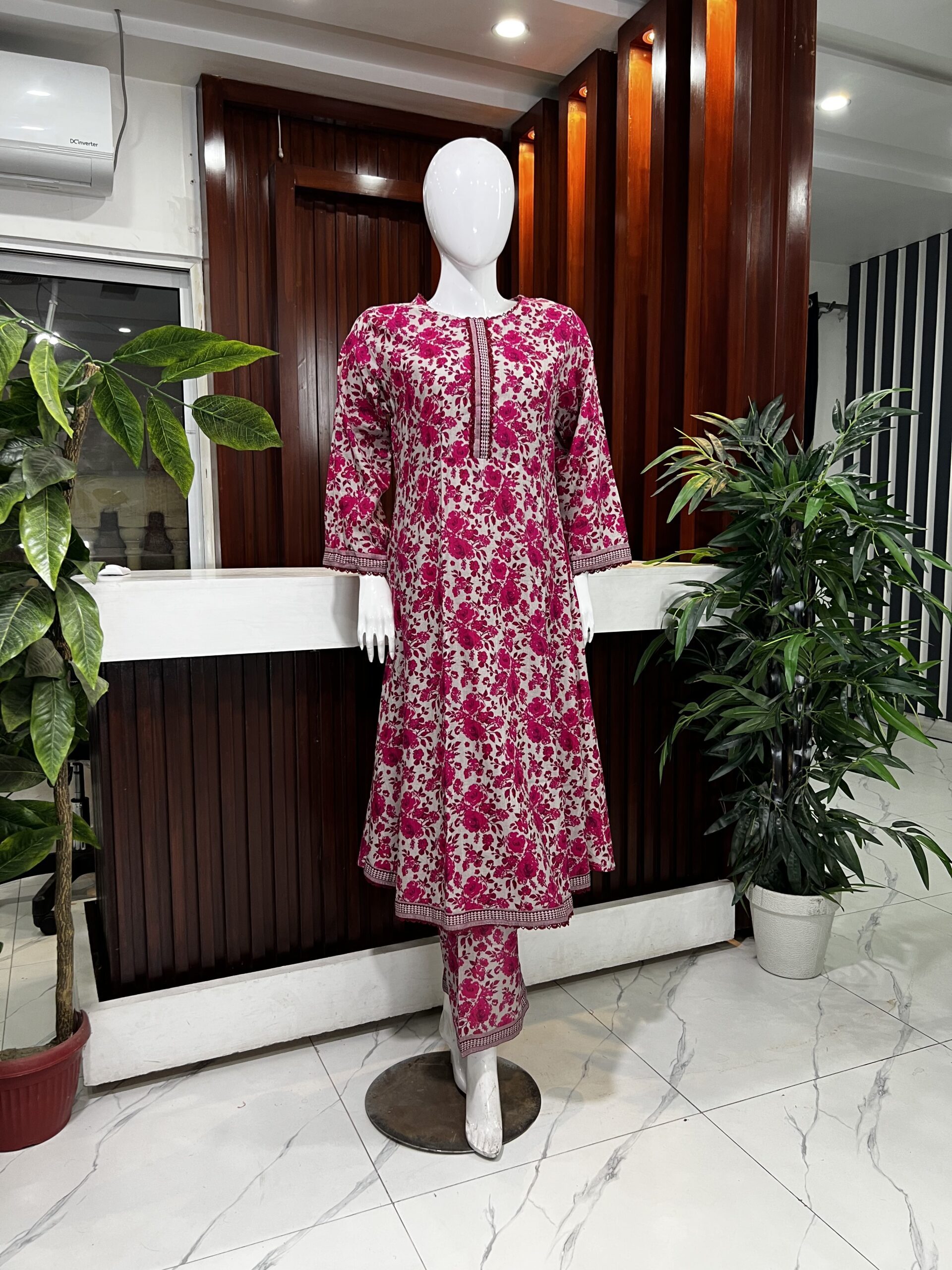 This khaddar frock showcases a beautifully detailed floral print that adds a lively yet elegant touch to your winter wardrobe. Designed with a graceful A-line silhouette, it features a finely embellished neckline and full sleeves for a refined look. The coordinated trouser completes the outfit, making it perfect for casual outings, daily wear, or cozy seasonal gatherings. A stylish and comfortable choice for those who love classic winter fashion with a modern feel.